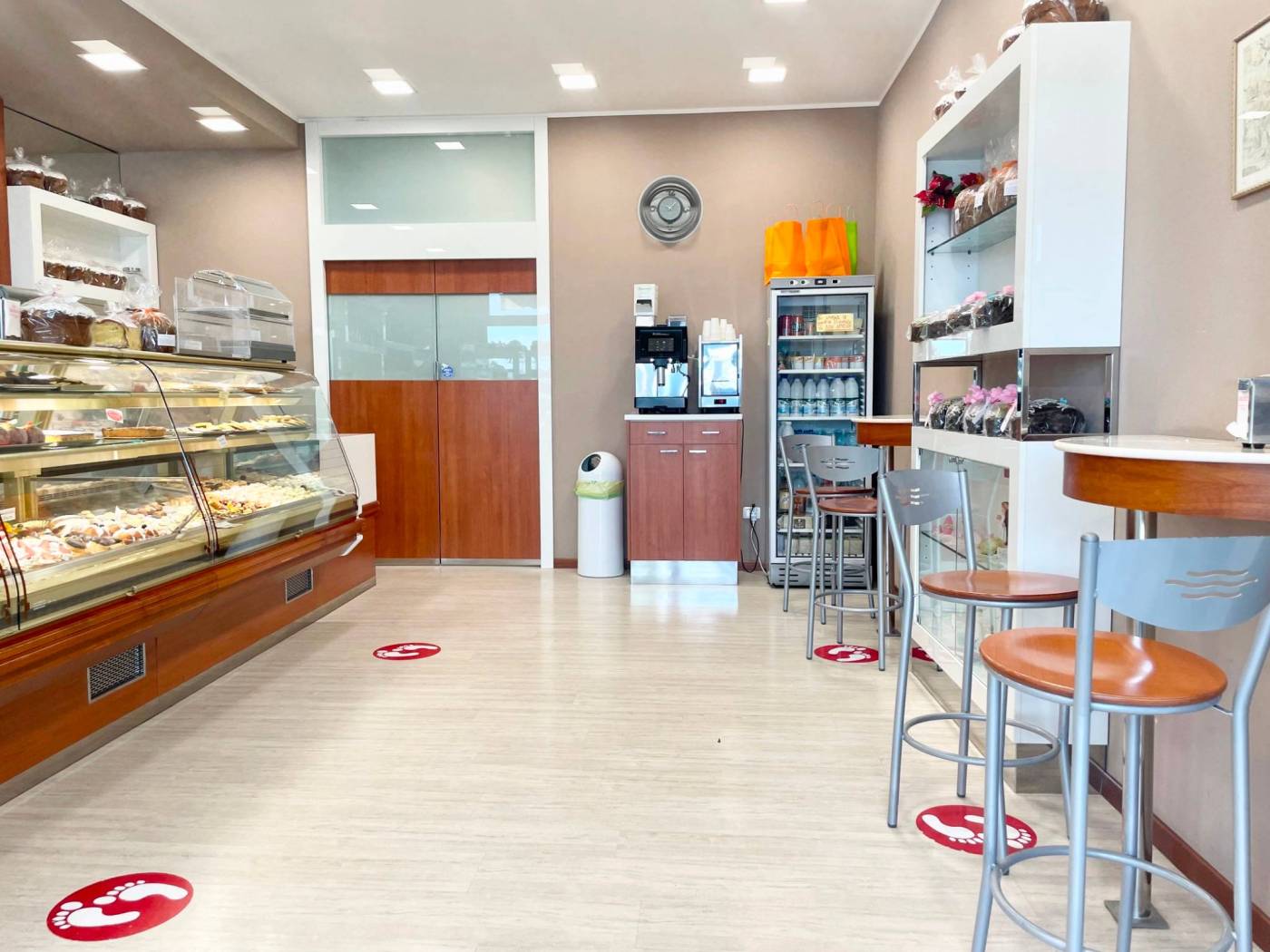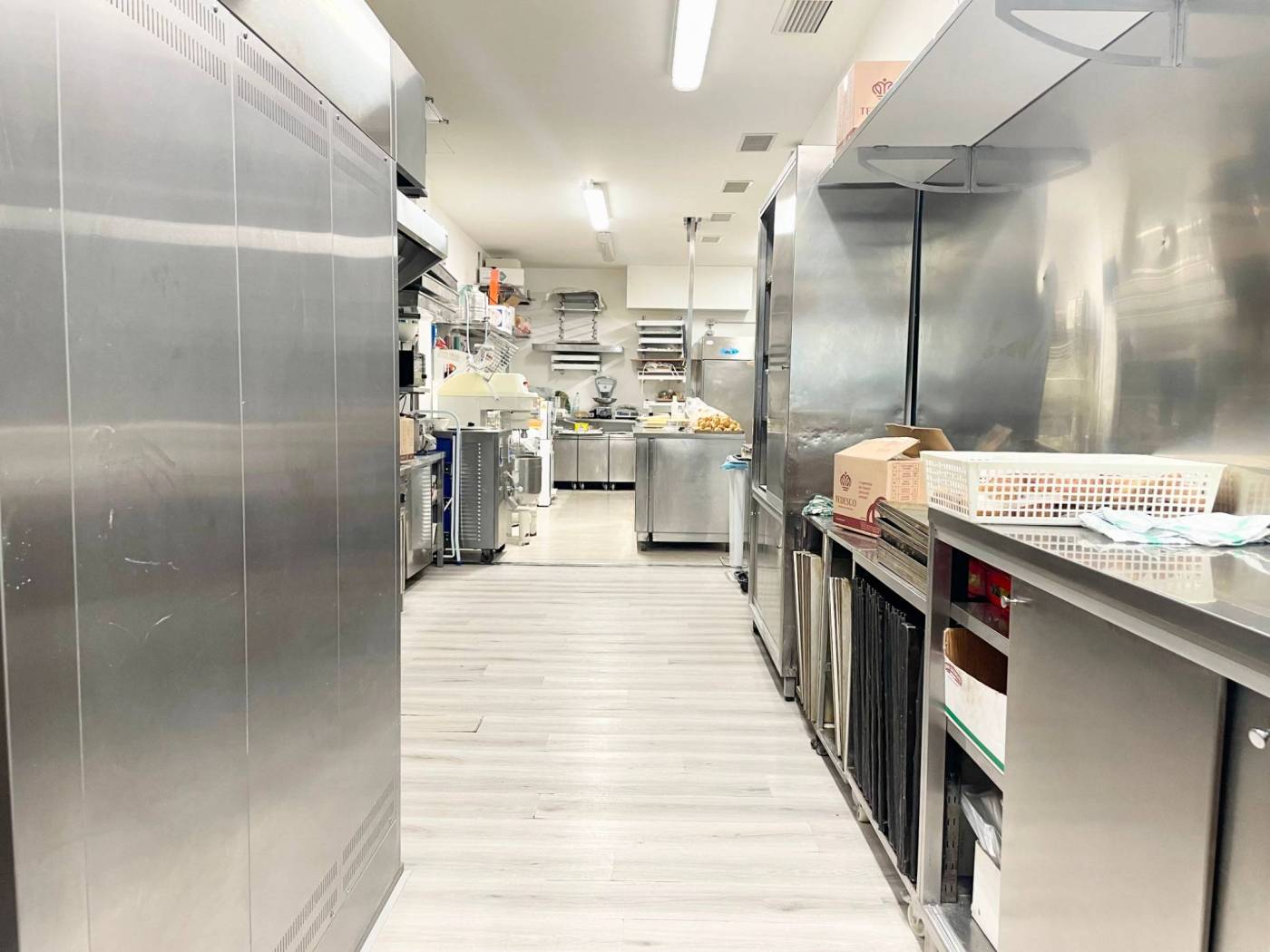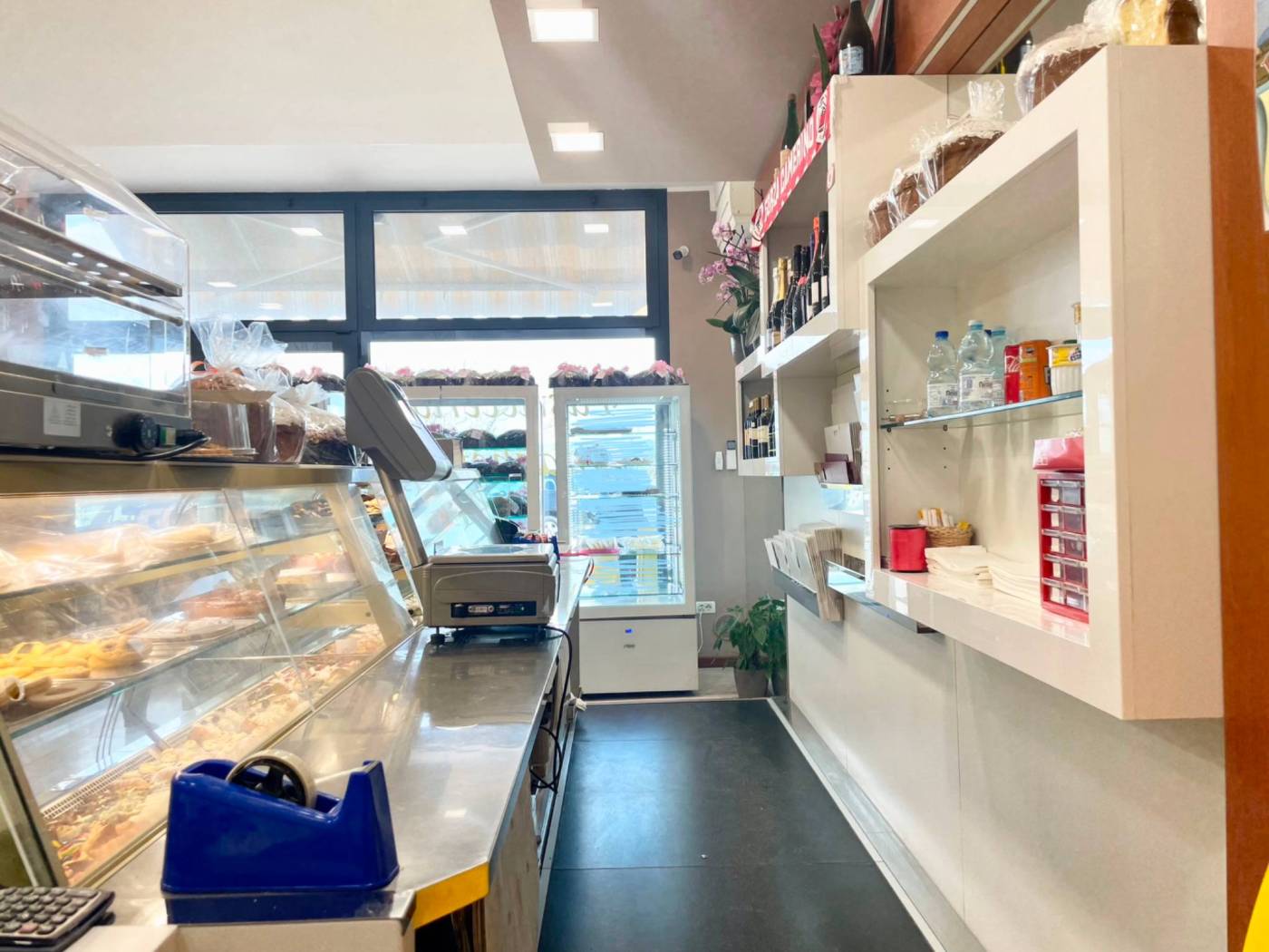 La soluzione si sviluppa su una metratura di circa 105 mq calpestabili, adibiti per circa 1/3 a spazio vendita con ampio bancone vetrina situato al centro, scaffalatura per esposizione prodotti posta avanti e dietro al bancone, tre vetrine – frigo e area caffe. I restanti 2/3 circa sono adibiti a laboratorio completamente attrezzato con locale deposito dotato di scaffalature in acciaio, anti-bagno (con armadietti per i dipendenti) e bagno.