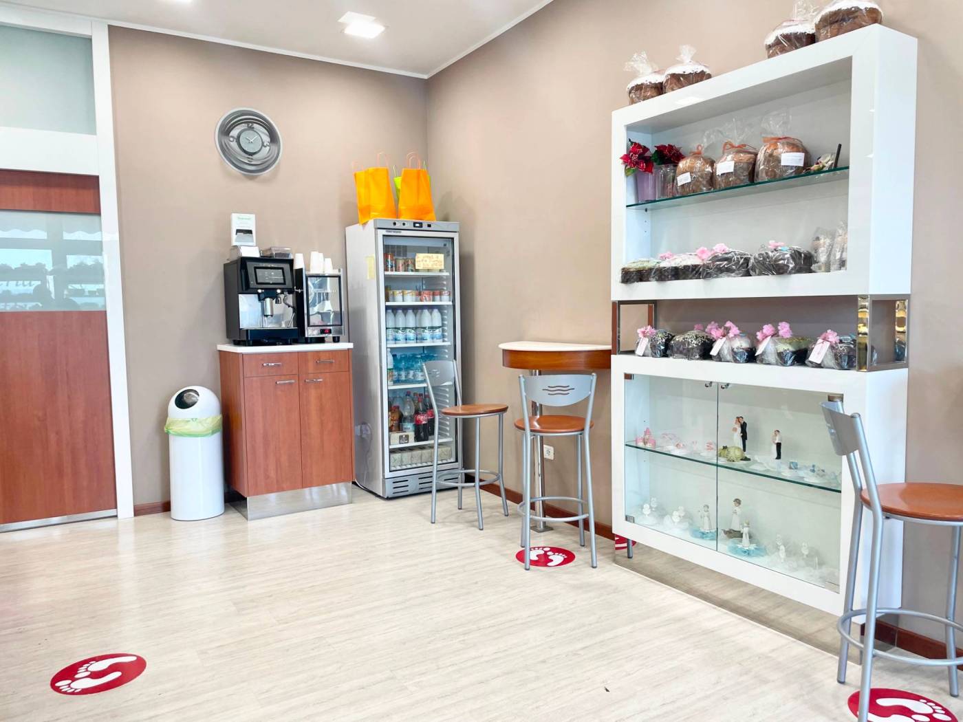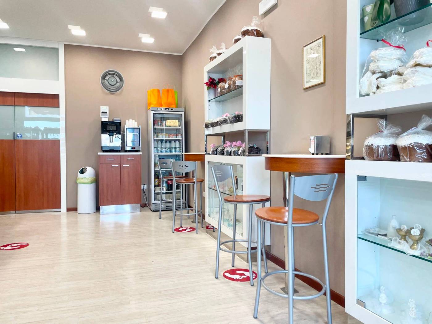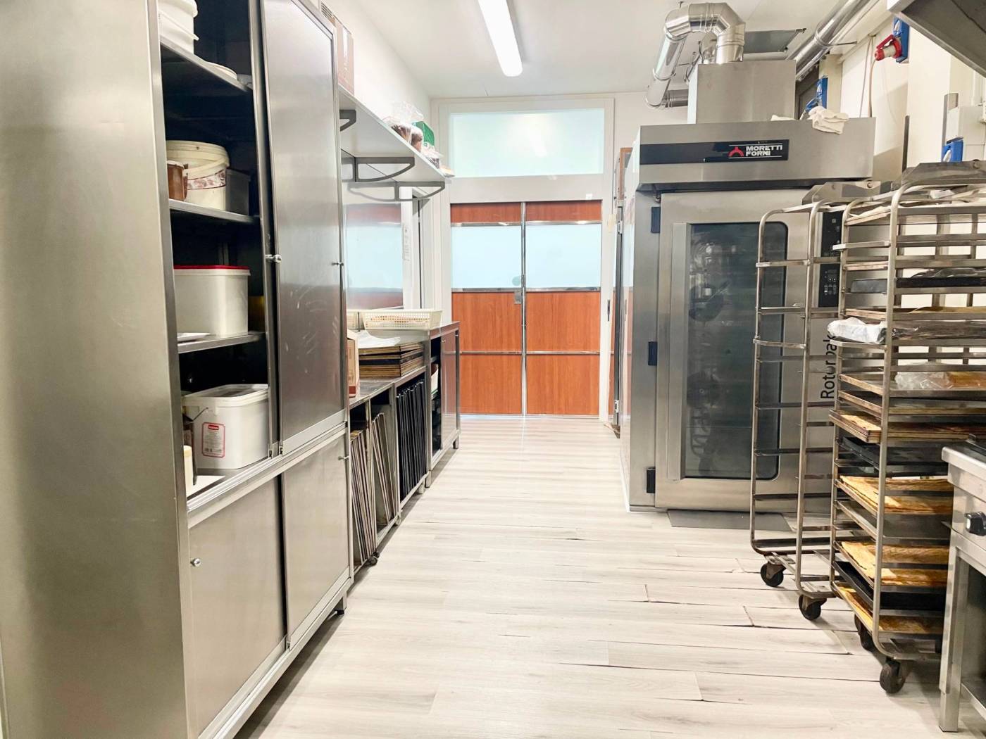 La soluzione si sviluppa su una metratura di circa 105 mq calpestabili, adibiti per circa 1/3 a spazio vendita con ampio bancone vetrina situato al centro, scaffalatura per esposizione prodotti posta avanti e dietro al bancone, tre vetrine – frigo e area caffe. I restanti 2/3 circa sono adibiti a laboratorio completamente attrezzato con locale deposito dotato di scaffalature in acciaio, anti-bagno (con armadietti per i dipendenti) e bagno.